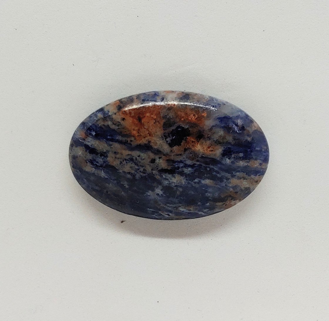 This blue sodalite has nice orange coloring among cloud like features. It measures